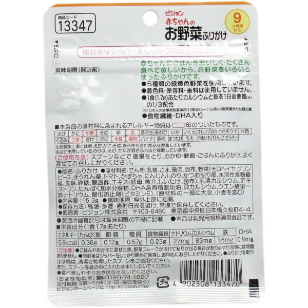 ピジョン株式会社個装サイズ:110X155X8mm個装重量:約20g内容量:15.3g【発売元:ピジョン】【原材料名】でん粉、乳糖、ごま、鶏肉、昆布、野菜(モロヘイヤ、グリンピース、ほうれん草、トマト、かぼちゃ、にんじん)、かつお削り節、のり、水溶性植物繊維、食塩、砂糖、醸造酢、エキス(酵母、魚介、しいたけ、昆布)、乳清カルシウム、デキストリン、たんぱく加水分解物、DHA含有精製魚油、貝カルシウム、クエン酸第一鉄ナトリウム、酸化防止剤(ビタミンE)、(原材料の一部に大豆、小麦を含む)【お召し上がり方】スプーンなどで適量をとり、おかゆ、軟飯、ごはんにふりかけて、よく混ぜてお召し上がりください。